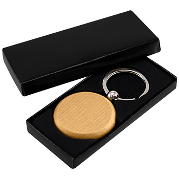 Llavero Redondo de Madera de Bamboo. Presentación en estuche laminado negro con cuna aterciopelada.
