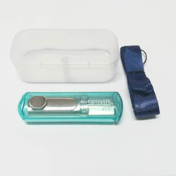 Práctico Timbre Tipo sello de bolsillo, manual, con tampón incluído, el cual puede ser recargado con la tinta para sellos de goma Automatik o en el caso de recambio sólo puede ser efectuado por el fabricante.